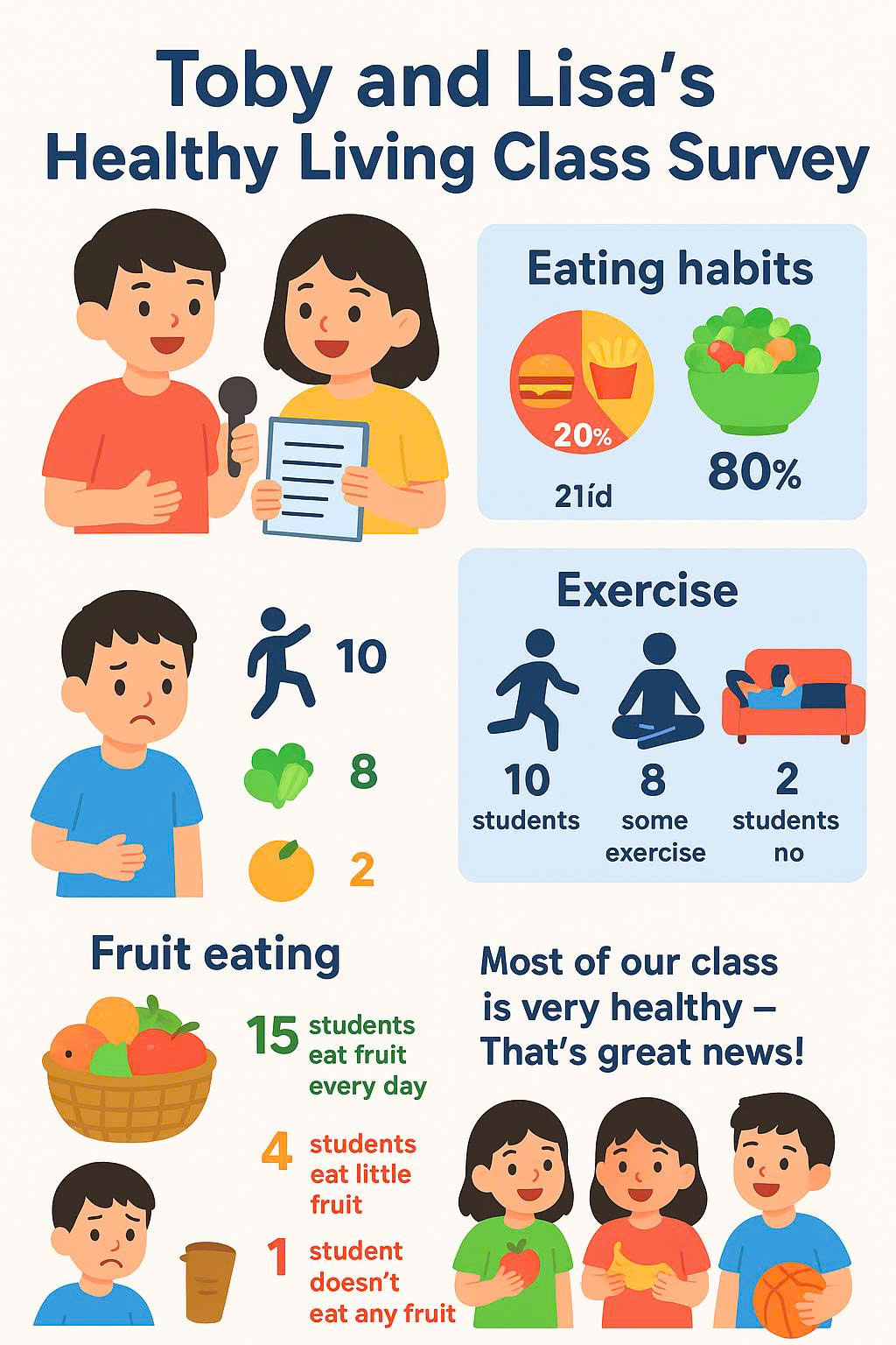 Chúng tôi đã hỏi những bạn cùng lớp về lối sống lành mạnh của họ. Hai người bạn nói rằng họ ăn nhiều đồ ăn nhanh, nhưng những người còn lại nói họ không ăn quá nhiều. 10 bạn nói rằng họ thường xuyên tập thể dục và 8 bạn nói họ cũng tập một số bài thể dục. Mặt khác, hai bạn nói rằng họ không tập thể dục! Chúng tôi nghĩ rằng họ thực sự lười.