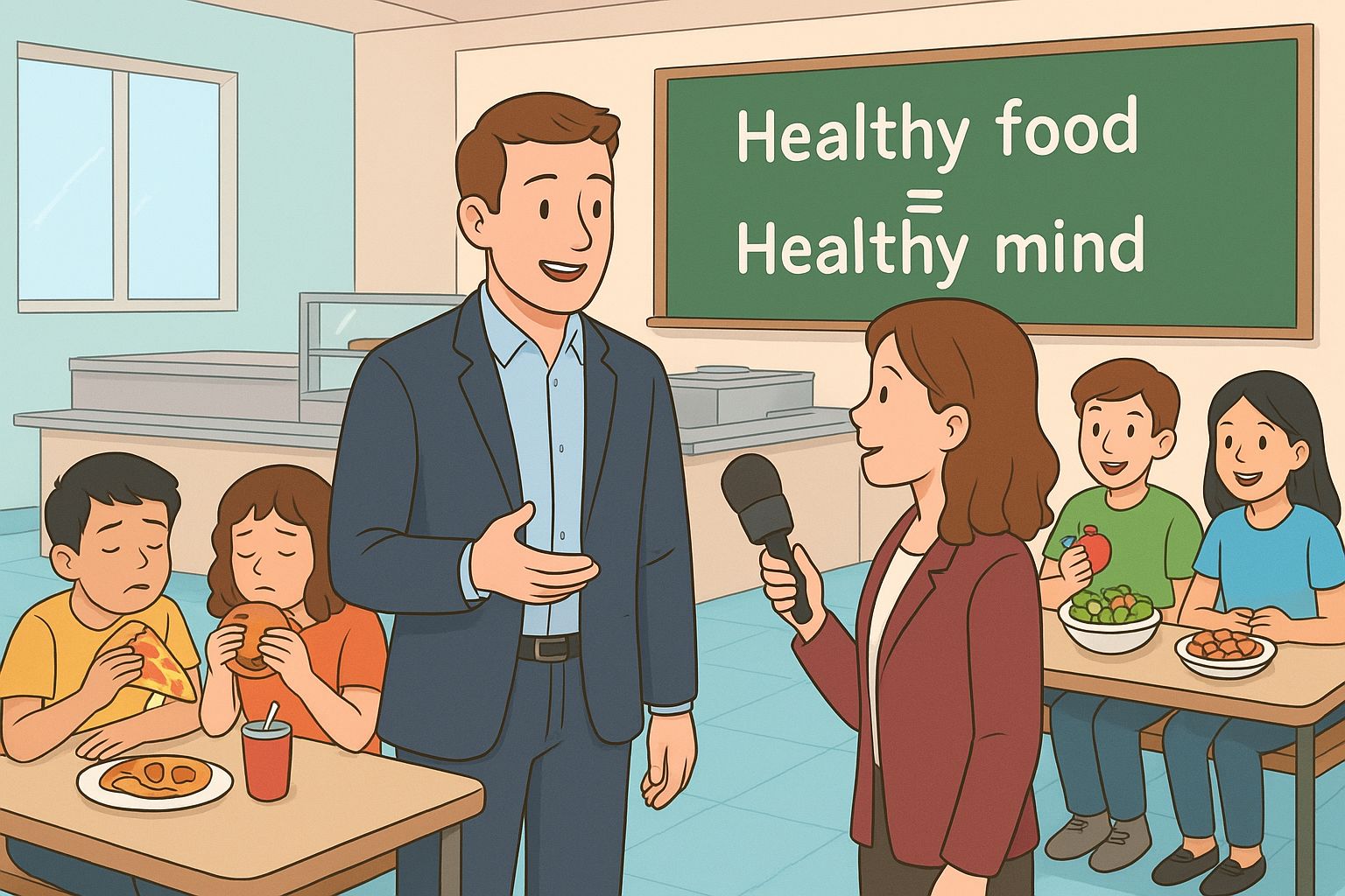 Man: Well, lots of schools only sell food and drinks like pizza, burgers, and soda. These are not healthy and really don’t help students learn and feel healthy. Fast food and soda have a lot of sugar and salt in them. In just a few hours after eating lunch, they will feel tired and it will be harder to listen in class.